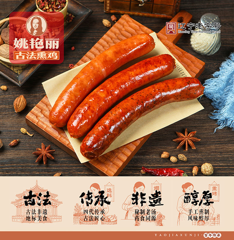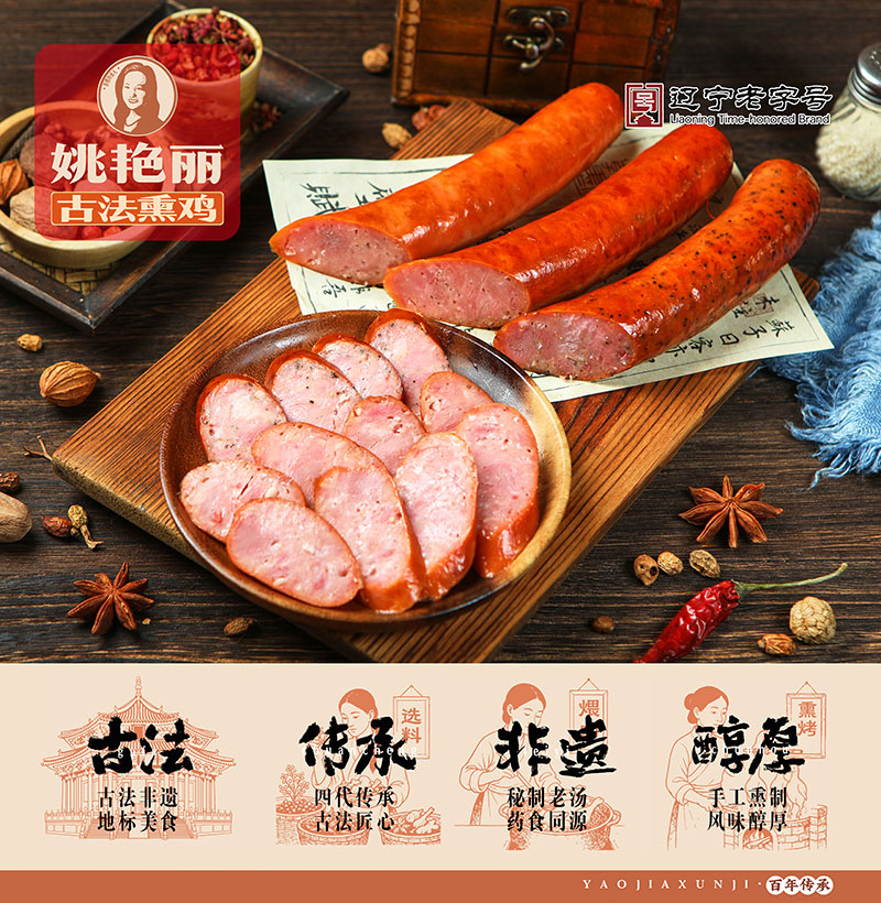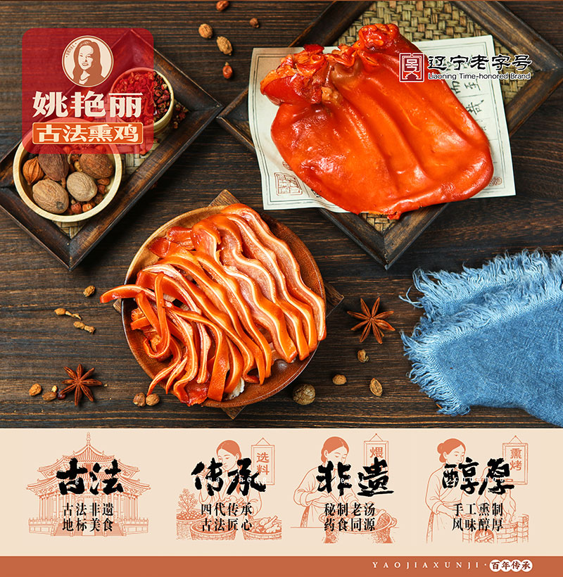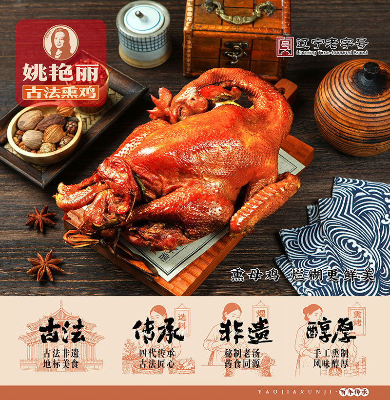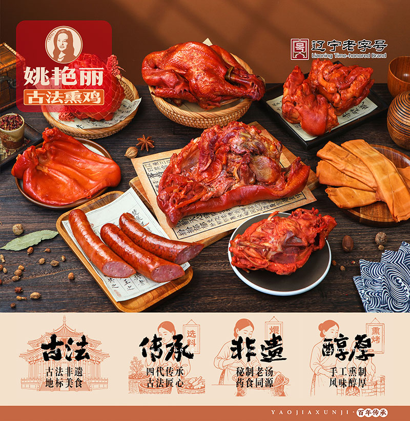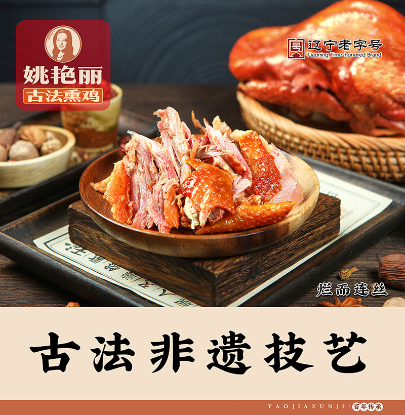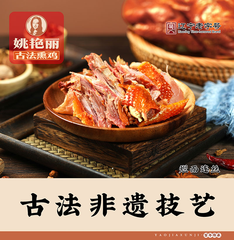 姚艳丽熏鸡 姚艳丽熏鸡是辽宁省锦州市沟帮子镇传统特色食品,始创于清光绪二十五年(1899年),历经五代传承,由沟帮子熏鸡制作技艺非遗传承人姚艳丽传承并发展,现为辽宁老字号及非物质文化遗产代表。该产品融合宫廷秘方与关东特色,选用一年以上母鸡为原料,配以三十余味中草药秘制老汤,经十六道古法工艺熏制而成,成品具有色泽枣红、肉质细嫩不柴、咸淡适口、香味浓郁、肥而不腻等特点,执行含水量≤5.46%、含盐量≤3.02%等严格质量标准。该品牌传承脉络始自刘世忠创立熏鸡作坊,经刘振生、姚青山等五代匠人改良配方,姚艳丽于2011年注册“姚艳丽”商标推动品牌化发展。2022年“姚